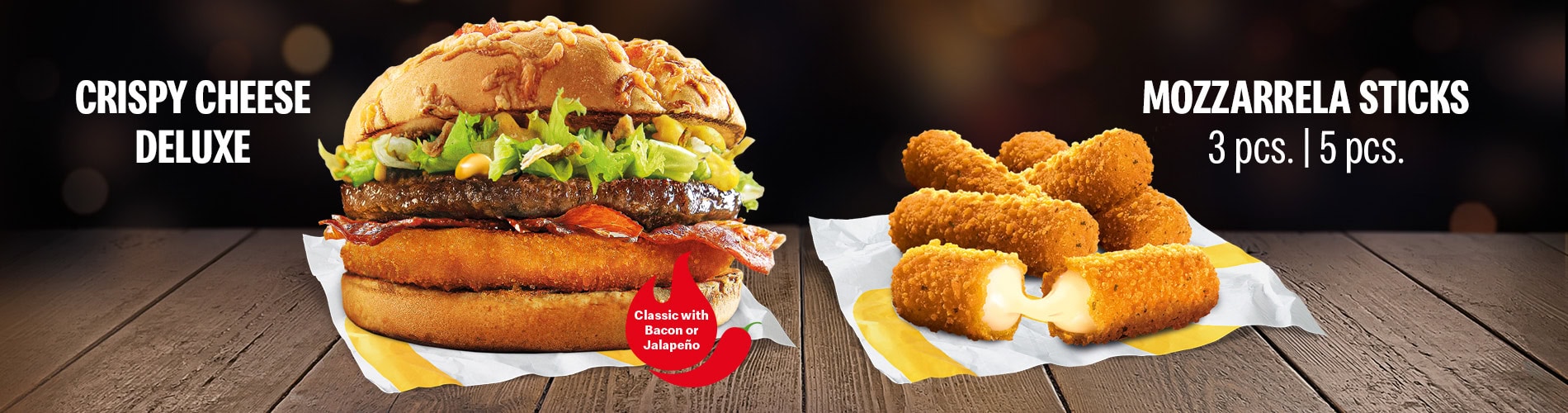 Let’s start with the irresistible Crispy Cheese Deluxe Beef! Imagine a soft, fluffy bun with a golden crispy crust, generously sprinkled with bacon and cheese. Inside – melted creamy cheese, fresh Iceberg lettuce, crispy onions, a special sauce, and of course, 100% juicy beef. Feeling bold? Try the spicy version with Jalapeño pepper!