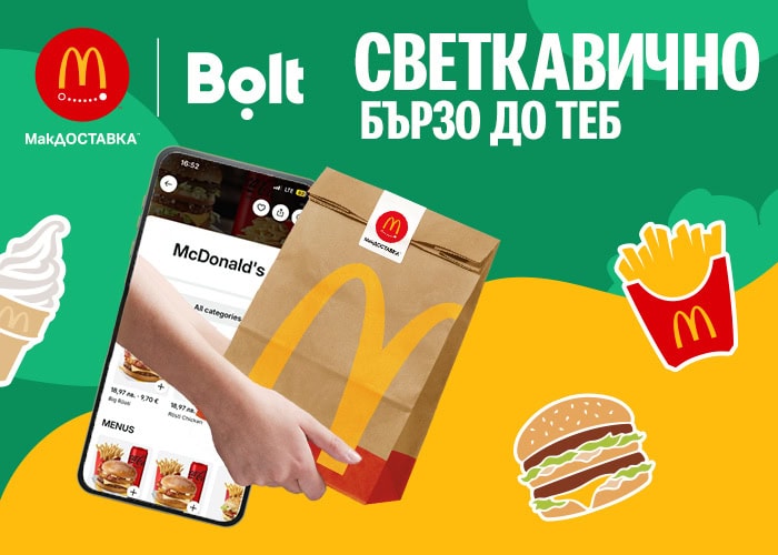 Големи новини! Макдоналдс™ България започва партньорство с Bolt Food и сме супер развълнувани! Това означава, че можеш да си поръчаш любимите менюта през услугата МакДОСТАВКА™ директно до вратата си. Без чакане, без опашки – само няколко клика в приложението и готово: Биг Мак™, любимите картофки, Чикън МакНагетс™ – според твоето настроение.