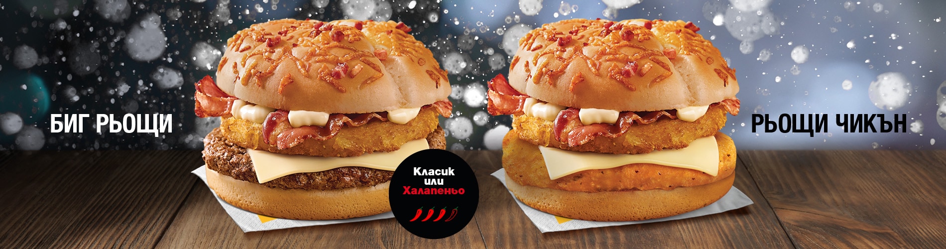 Биг Рьощи – Пухкаво златисто хлебче с парченца бекон и препечен кашкавал, прегръщащо слайсове хрупкав бекон, неустоимо сирене Ементал, вкусно Рьощи пати със 100 % сочно телешко месо и любимия Рьощи сос.